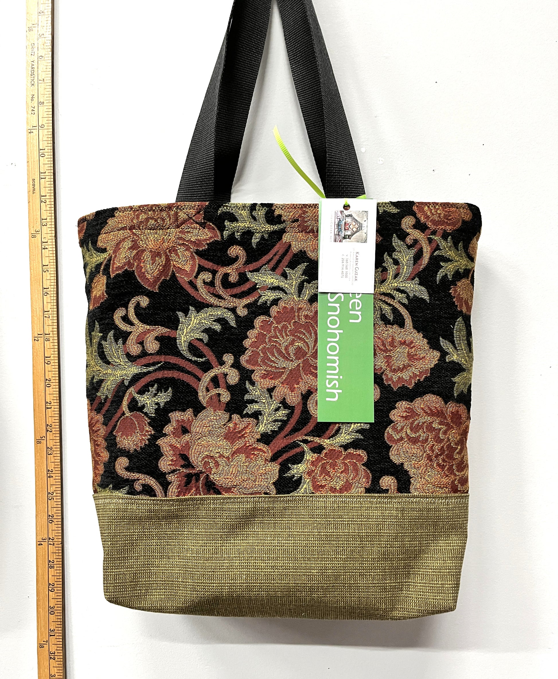 - Features: Luscious flowers on a black background in a sturdy upholstery fabric. The lining is cut from an orange tablecloth with an interior pocket.